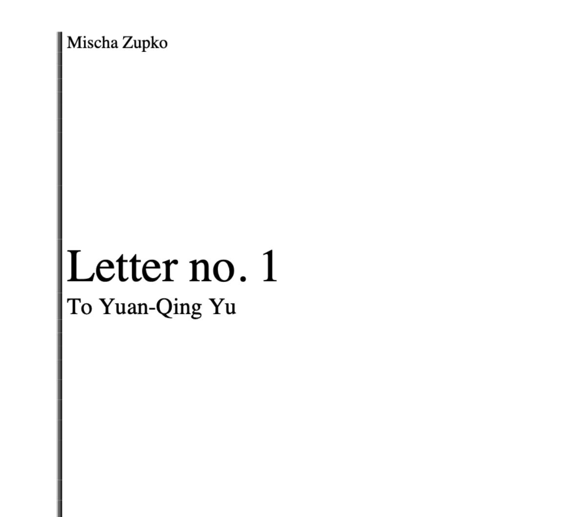 A composer is fortunate to be asked for work in the form of commissions, but there are times when one writes simply because they have something they need to say.  Letter no. 1 was inspired through conversation with Yuan-Qing Yu about the act of writing letters as a way of entering and deepening relationships.   Writing a musical letter seemed a natural extension of this idea so inspiration took the form of this first letter to Yuan-Qing.  The score was written without her prior knowledge, much in the way a letter is written, and upon completion was delivered directly to her mailbox.  The piece is not couched in extra-musical reference, but more of a conversation; a conversation that begins simply and evolves into ever expanding ideas, relationships and meanings.  In a very direct way, the 3-note and 5-note rhythms in the opening melody become the basis of ever-expanding relationships. These rhythms are heard simultaneously at various speeds and ultimately the relationship of 3:5 dictates differentiated tempos between the violin and the piano where each voice possesses its own inner pulse yet both voices are completely engaged in the act of unfolding the idea.  Through this process, the music indulges in a great variety of emotional states and poignant reactions without feeling as if the thread is ever lost.  This work was written for and dedicated to Yuan-Qing for the artistry she brings to her music and to all of her relationships.