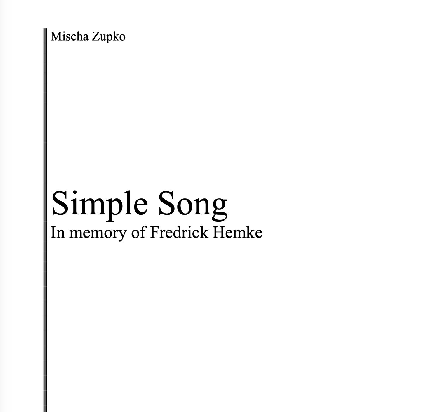 Simple Song was composed upon learning of the death of my dear friend, Dr. Fredrick Hemke. As an icon of the classical saxophone world Fred was revered by all, but what made him so special was that he had as much love and respect for those he mentored and inspired as those folks did for him. For me personally, Fred was a great champion. As a piano student at Northwestern he inspired me weekly when I would play for his students and as a composer, he commissioned my work and was instrumental in making my saxophone music known throughout the world. He gave without ever expecting anything because he was already full; full of light, life, and so much music, abundant to share with all those he encountered. Simple Song was a simple gift where I could express the fullness of my gratitude in a way my words never could.
